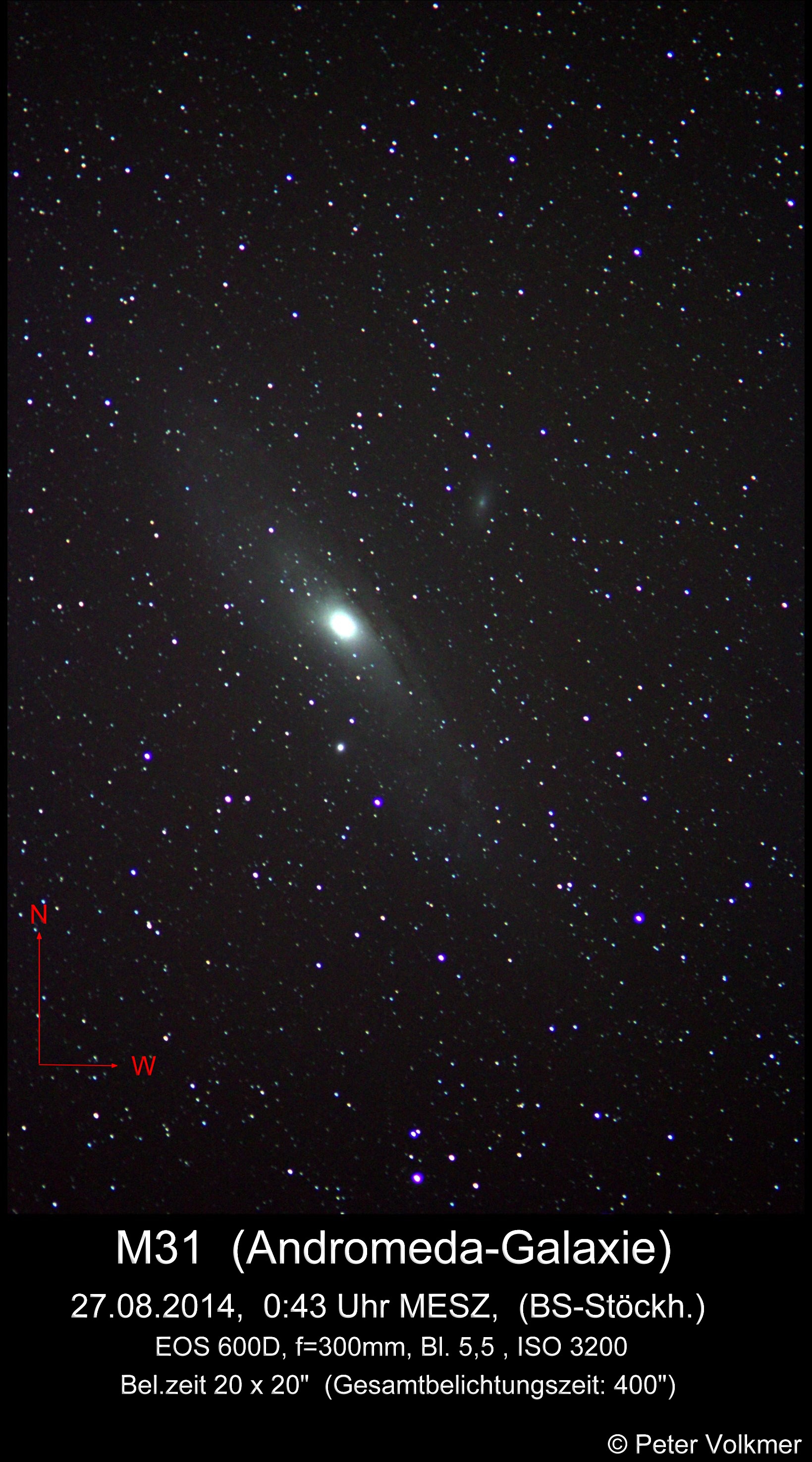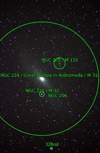M 31 ist bereits als nebliger Fleck der Helligkeit 4mag bei dunklem Himmel mit bloßem Auge zu sehen. Auf diesem Foto sind ebenfalls die Begleitergalaxien M 110 und M 32 zu erkennen sowie andeutungsweise die Spiralarme von M 31.