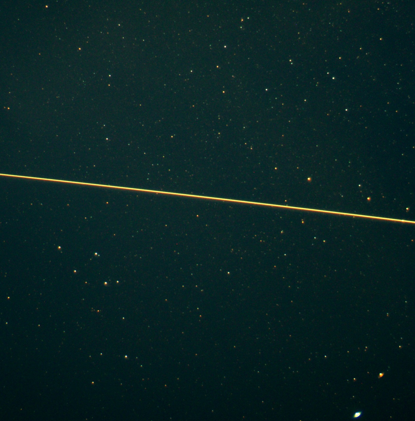 Am 26.5.2014 gelang mir um 3:28 Uhr MESZ eine Aufnahme, die den Vorbeiflug der ISS (Helligkeit: -3,3 mag) in der Nähe der NOVA dokumentiert:
