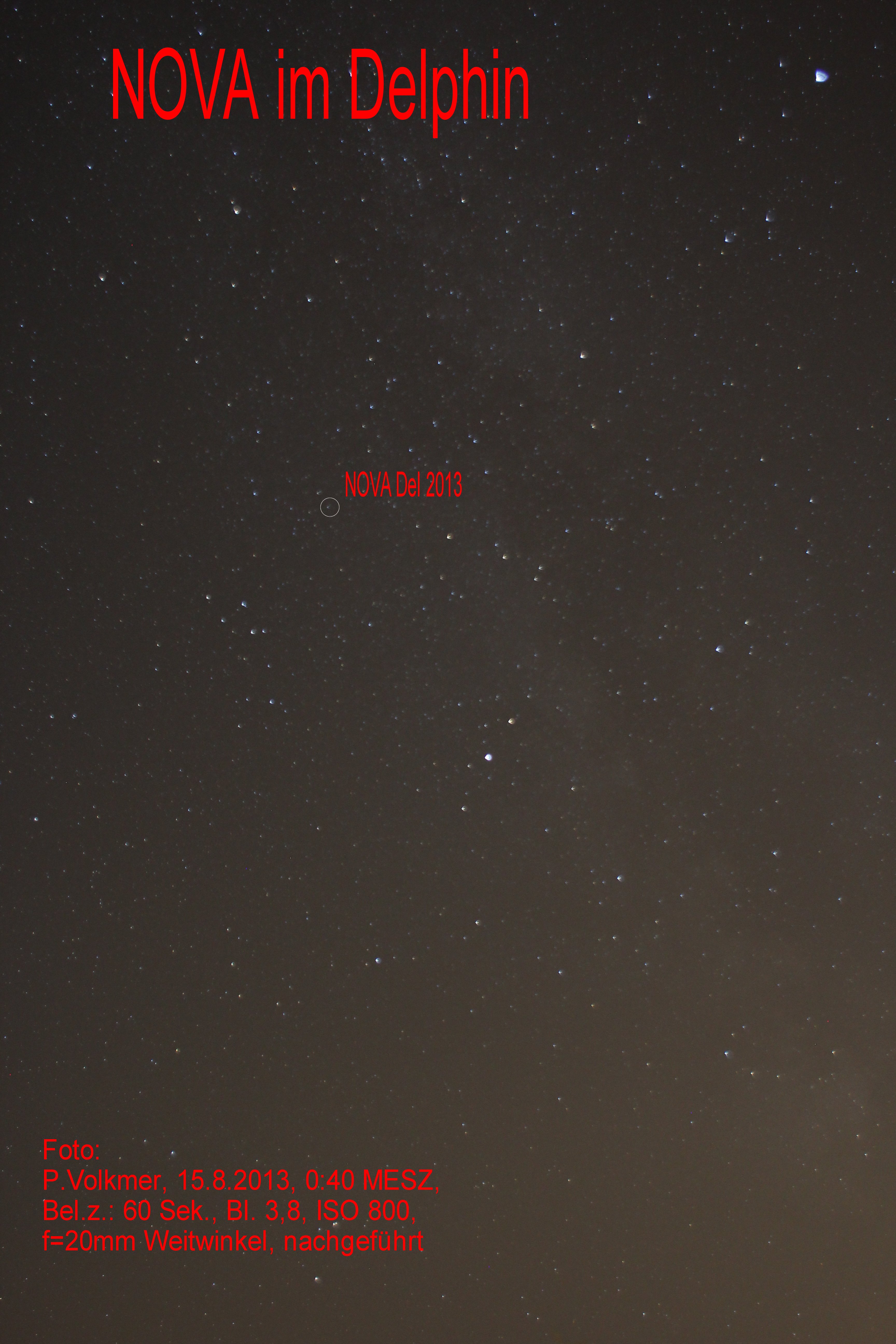 Am 14.08.2013 entdeckte ein Japaner wieder einmal eine NOVA, die mit bloßem Auge zu sehen war. Sie trat in unserer Milchstraße im Sternbild Delphin auf. Die letzten Novae dieser Art konnten 1999 beobachtet werden.