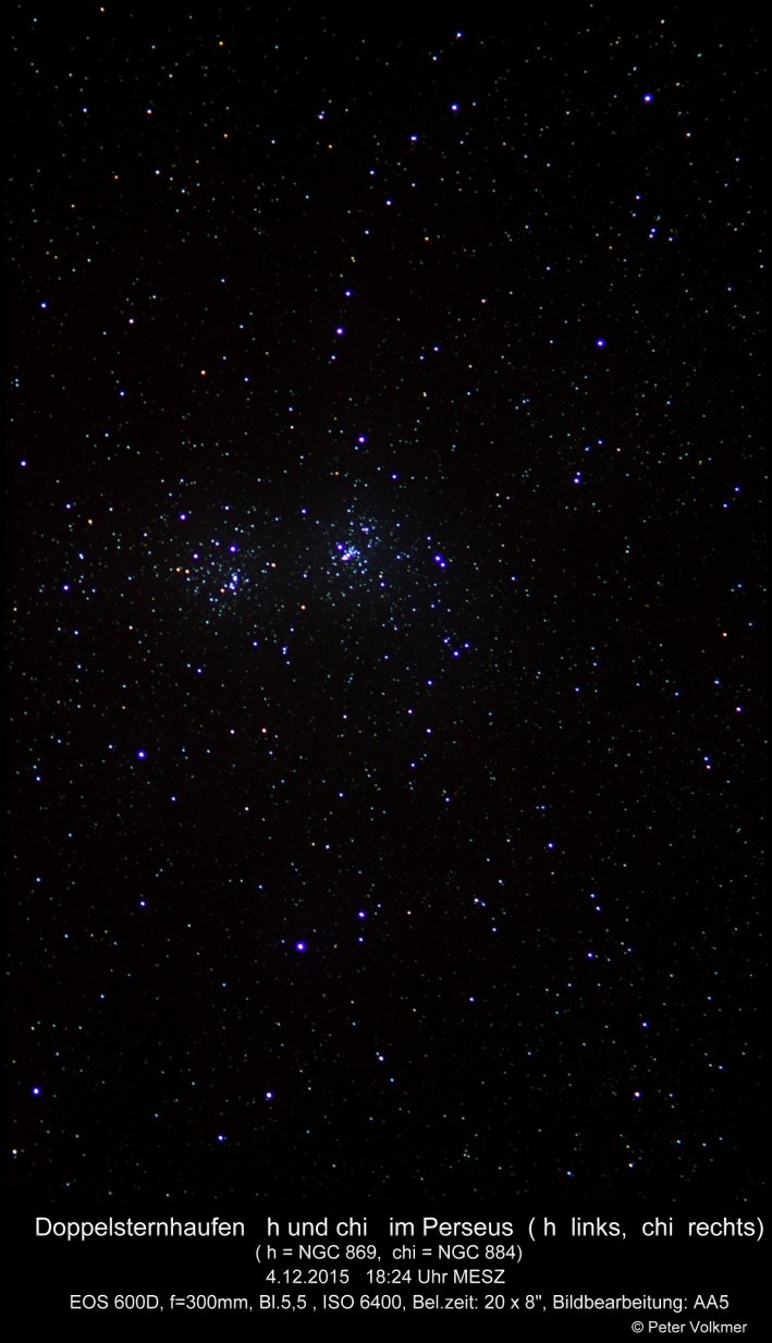 Hinweis: In einer dunklen Nacht kann dieser offene Doppelsternhaufen bereits mit bloßem Auge als Nebelfleck gesehen werden.