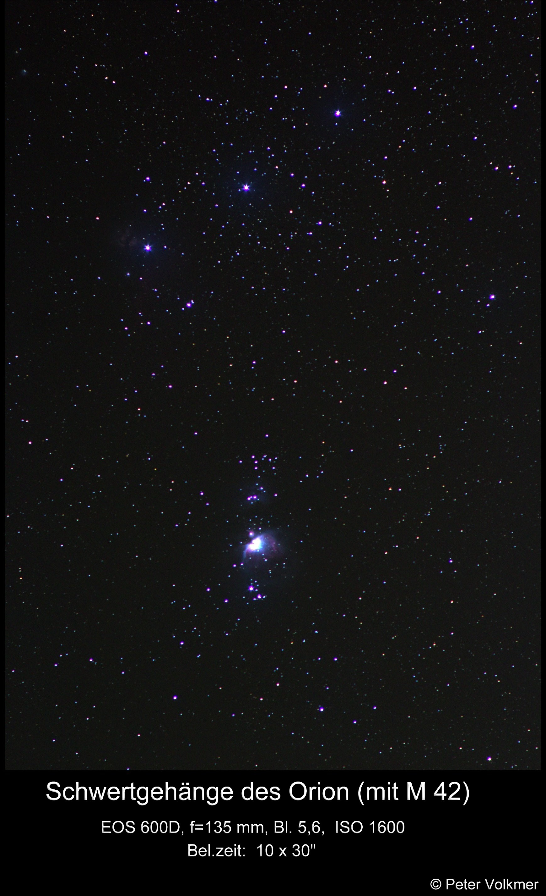 Deutlich in dieser Aufnahme ist der Gasnebel M 42 zu sehen, andeutungsweise auch der Pferdekopfnebel links neben dem linken Gürtelstern des Orion.