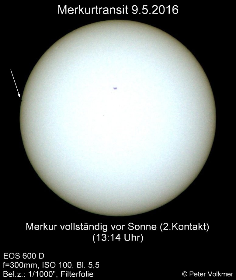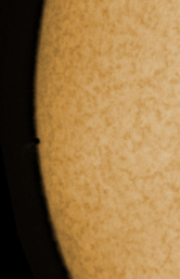 Der Merkur ist beinahe vollständig vor der Sonnenscheibe getreten (13:14), am Eintrittsort steht, schwach sichtbar, eine kleine Protuberanz: