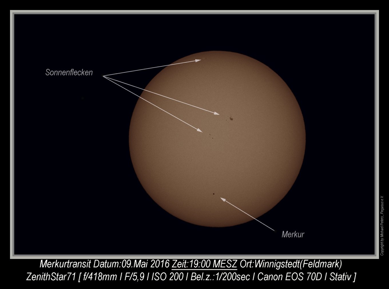 Während Peter Volkmer nur etwa bis 15:30 Uhr den Transit dokumentierte, konnte Michael Peters erst die zweite Hälfte des Transits fotografieren. Hier seine Einzelaufnahmen, die mit Peters Aufnahmen zusammen den gesamten Transit verfolgen lassen: