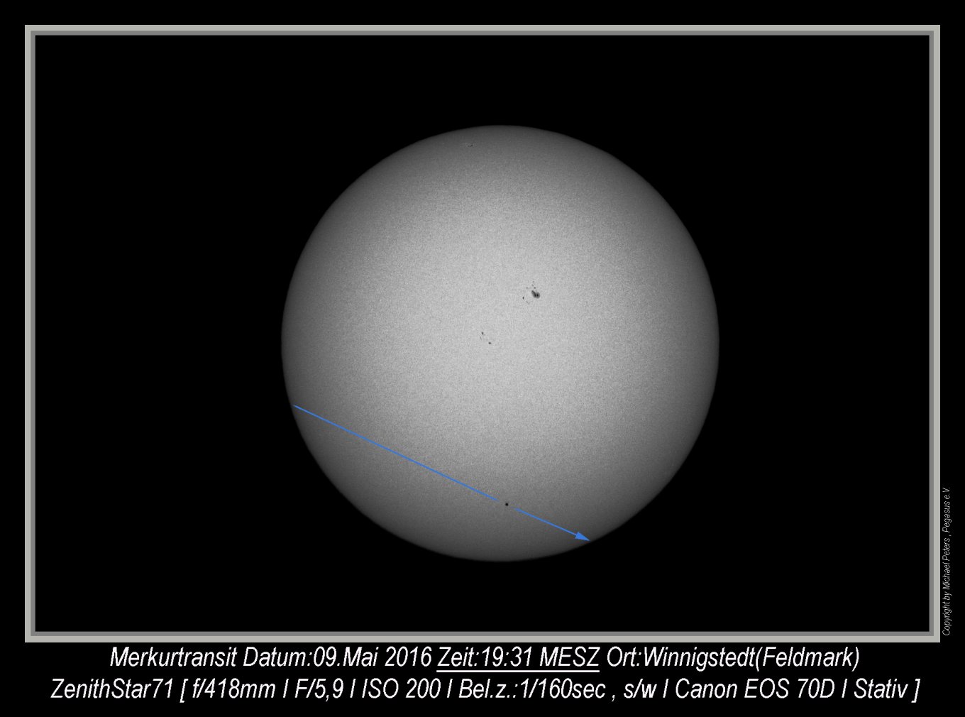 Der Durchgang konnte nur zu Anfang beobachtet werden, dann zog eine geschlossene Wolkendecke auf.