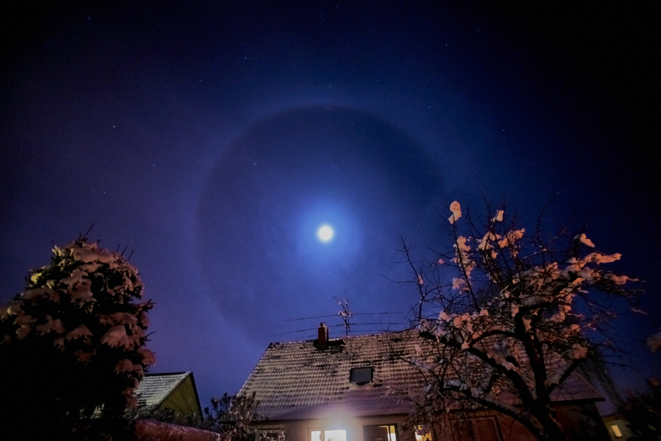 beobachten. Es gibt diese kreisförmigen Halos mit einem Öffnungswinkel von 22° und von 46°. Der 46°-Halo ist sehr selten.